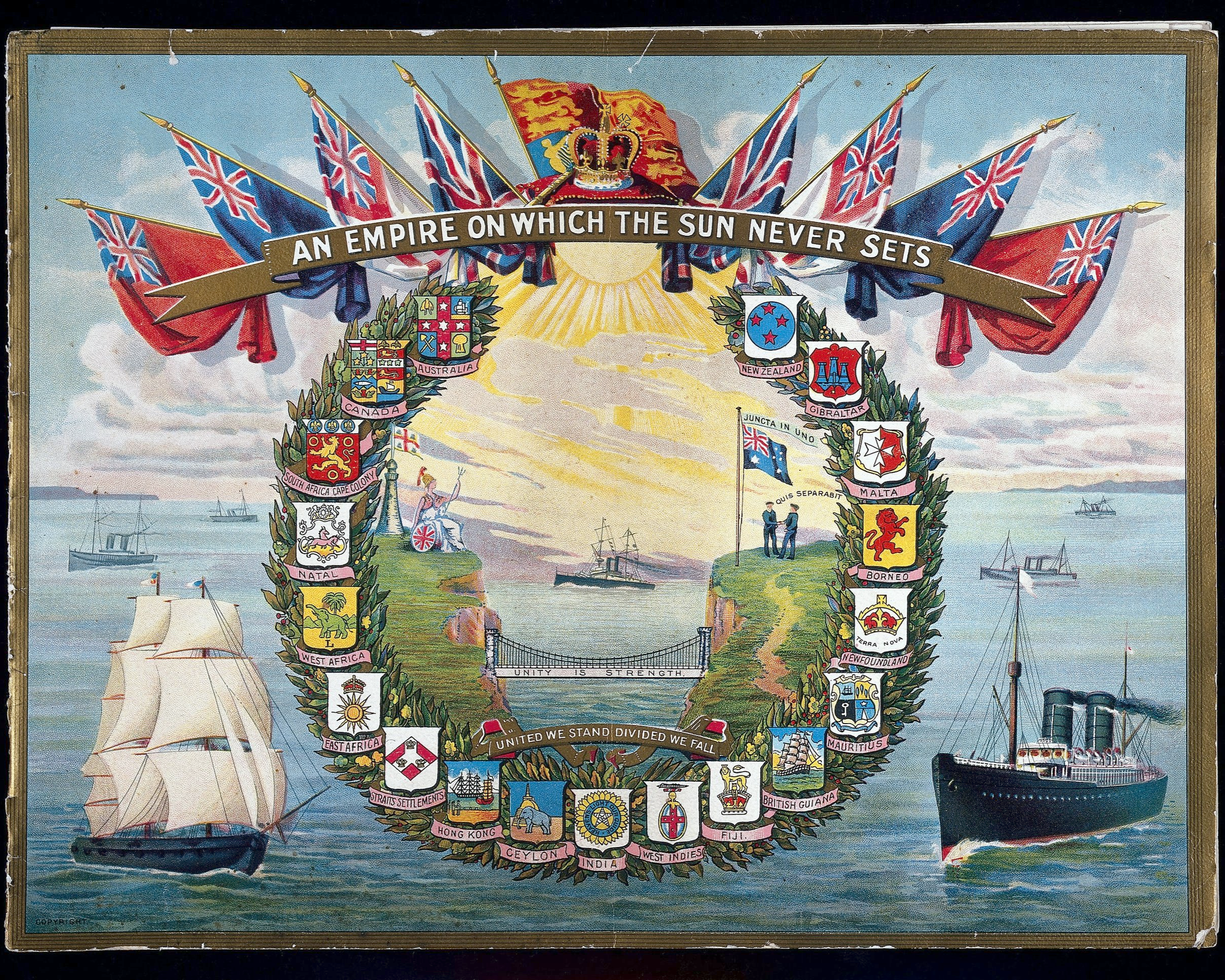 Image Details: Front cover of Seamen's hospital booklet: Illustration: “An empire on which the sun never sets”: including all crests of British colonies: Australia, Canada, India, Fiji, etc. Wellcome Collection.